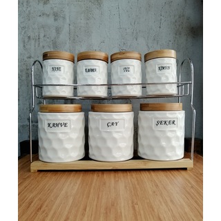 7li Askılı Standlı Bambu Porselen Baharatlık Baharat Takımı